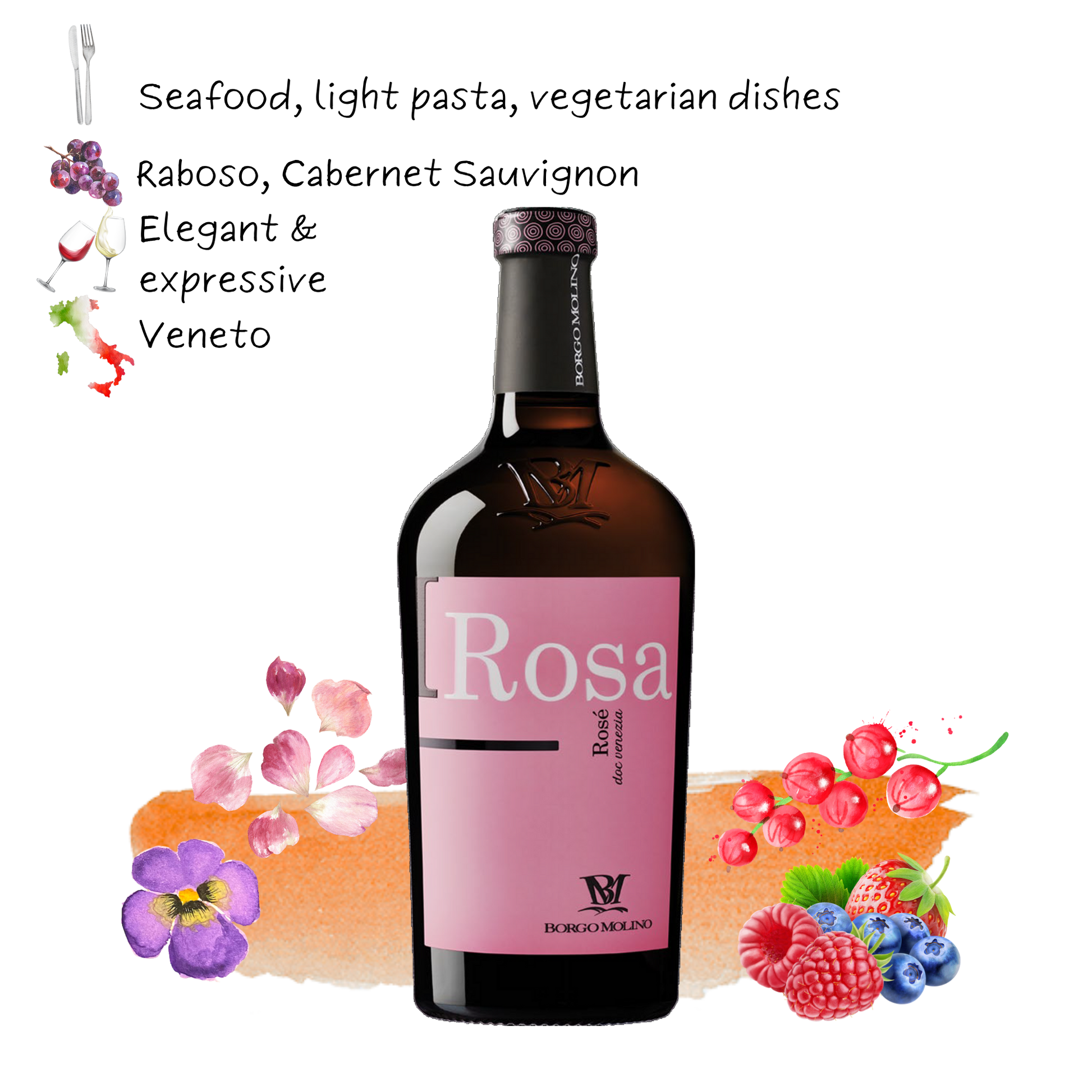 Elegant and expressive, the 2023 Borgo Molino ROSA Rosé D.O.C. Venezia captures the fresh, floral charm of Italy’s Veneto region. Made from a blend of Raboso and Cabernet Sauvignon, this dry rosé is delicate in colour with a pale copper-pink hue and a soft, persistent sparkle.